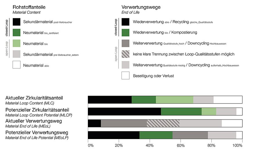 Der Kreislaufstatus unterscheidet in der Bewertung der Herstellungsphase von Baustoffen in Anteile, die nachwachsend sind, also aus biotischen Kreisläufen stammen – Darstellung im Balkendiagramm hellgrün bis dunkelgrün – und in Anteile, die aus technischen Verwertungskreisläufen stammen – Darstellung im Balkendiagramm hellgrau bis schwarz. Neumaterial in der Herstellung wird in den Balkendiagrammen weiß dargestellt.